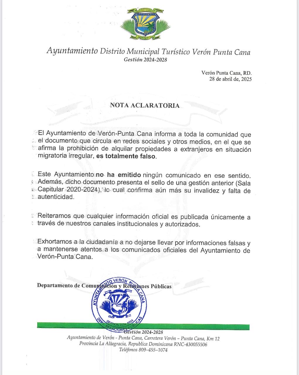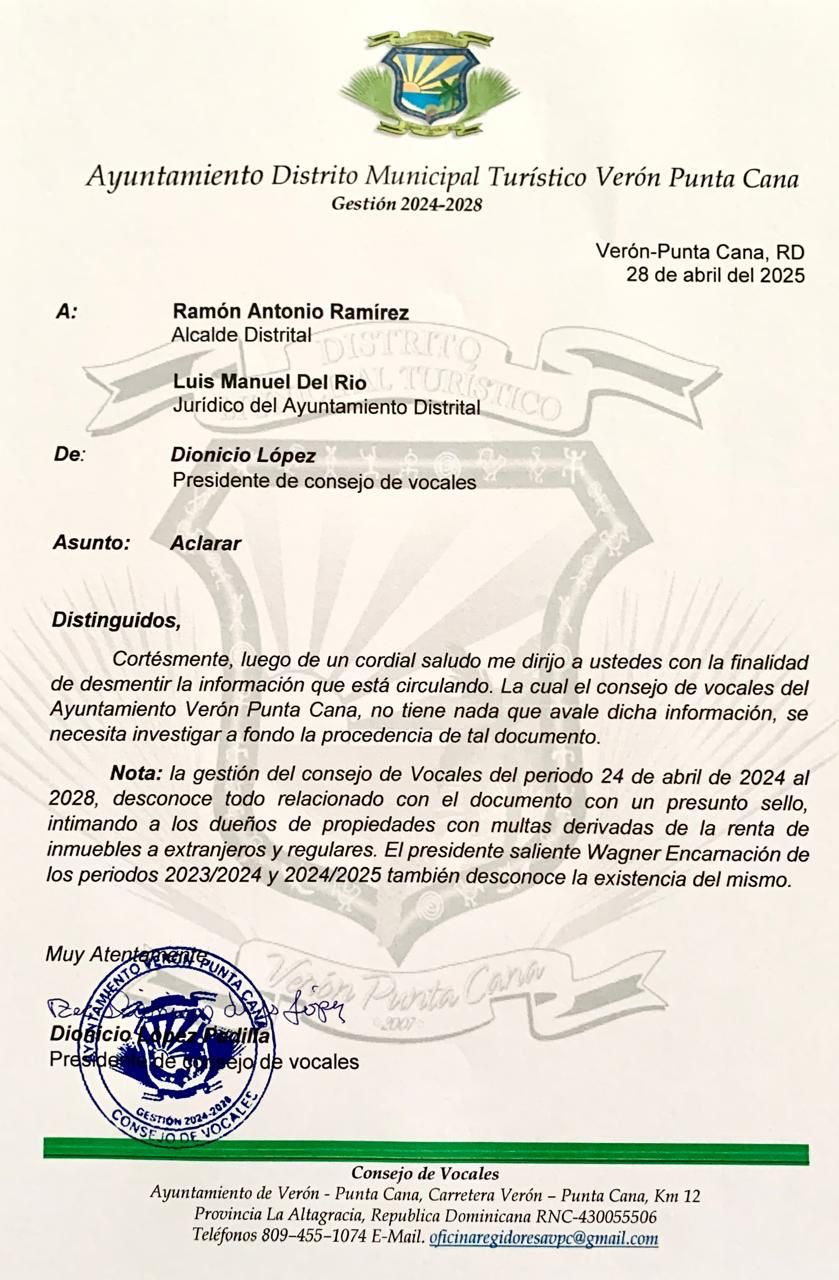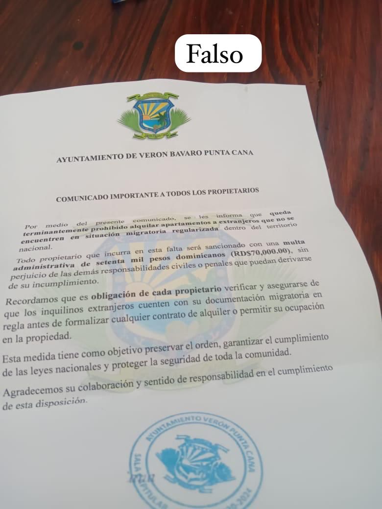 VERÓN PUNTA CANA, RD. – El Ayuntamiento de Verón Punta Cana desmintió este lunes la veracidad de un supuesto comunicado que circula entre residentes y propietarios, el cual advertía sobre sanciones de setenta mil pesos dominicanos (RD$70,000) a quienes alquilaran inmuebles a extranjeros en situación migratoria irregular.
