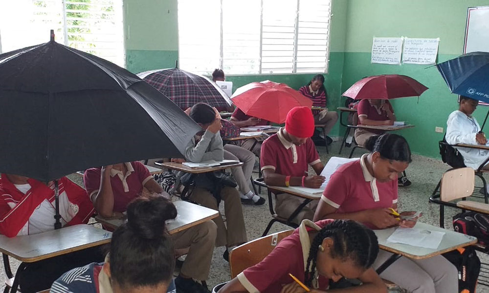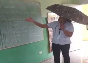 La situación empeora en tiempo de lluvias, lo que obliga a la clase magisterial y al estudiantado usar sombrillas y plásticos para no mojarse.