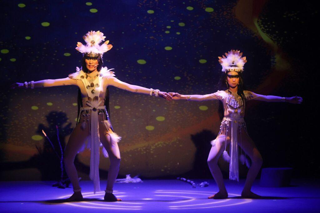 El relato escénico recorre desde el nacimiento de la cacica hasta su muerte, integrando elementos como el sol y la luna para marcar las distintas etapas del relato.