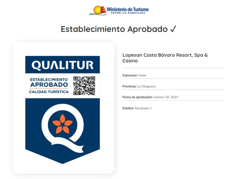 PUNTA CANA. RD – El Ministerio de Turismo de la República Dominicana (MITUR) otorgó la certificación de calidad turística “Qualitur” al Lopesan Costa Bávaro Resort, Spa & Casino, luego de un proceso de evaluación que incluyó inspecciones técnicas y verificación de estándares en su operación.