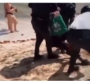 En la foto, arriba, se muestra un acto de violencia y falta de control de politur en Bávaro: cuando turistas presenciaron una bochornosa brutalidad contra un vendedor que presuntamente y sin confirmada queja de que éste se niega a dar pago a agentes para poder vender en la playa.