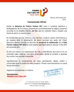 «La tragedia ocurrida en la discoteca Jet Set, que ha cobrado la vida de varias personas y dejado a muchos heridos, ha conmocionado profundamente al país. En señal de respeto y solidaridad con las víctimas y sus familias, el Premio Cultura VIP ha decidido posponer la celebración de su evento anual».