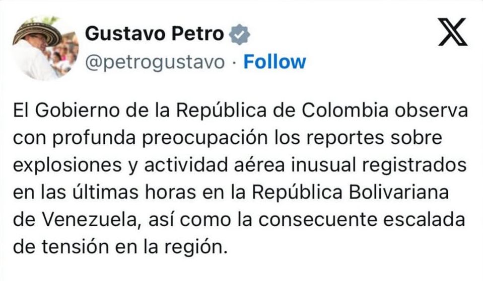 1) COLOMBIA: El presidente Gustavo Petro condenó la acción unilateral de Estados Unidos, destacando la necesidad de preservar la paz regional mediante el diálogo y la diplomacia, y rechazó cualquier acción militar que ponga en riesgo a la población civil.