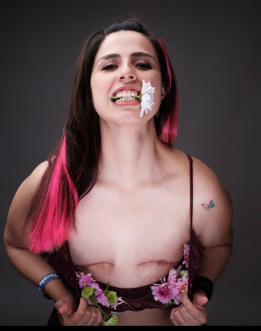 Ella tuvo que asumir el saber que sus senos no estarían presentes porque el cáncer pasó por su cuerpo y en vez de senos lleva una marca que representa lo que tuvo que a travesar para estar donde está hoy en día.