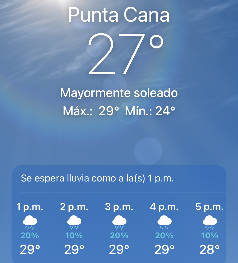 PUNTA CANA, RD. – Este lunes, el clima en Punta Cana se presenta estable durante las primeras horas del día, con una temperatura actual de 27 °C bajo un cielo mayormente soleado. La humedad se mantiene alta, con un promedio del 81 %, lo que incrementa la sensación térmica y podría generar incomodidad en espacios cerrados o sin ventilación.