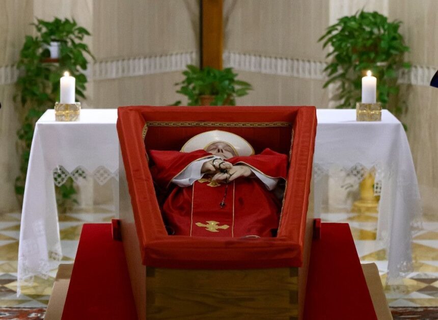 VATICANO.– Las imágenes fueron captadas durante el acto de constatación de la muerte del pontífice y muestran a Francisco vestido con una túnica roja, color litúrgico reservado para los funerales papales. Sobre su cabeza lleva una mitra blanca, y sus manos sostienen un rosario negro, símbolo de su devoción mariana. El papa yace en un féretro de madera, forrado con terciopelo rojo, dispuesto en la capilla privada de su residencia, rodeado de colaboradores cercanos y cardenales presentes en Roma.